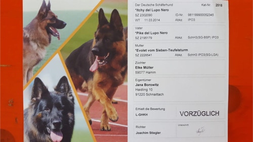 Itchy del Lupo Nero - die glänzende Vorbereitung in allen Bereichen wird von der Bewertung V16 auf der Bundessiegerhauptzuchtschau gekrönt. Einer der besten Schutzdienste der Veranstaltung! Jana - spektakulär.